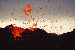 UN THÉÂTRE D'OMBRESÀ peine entamée la descente des rampes de Bois-Blanc, on ne peut ignorer ce qui se passe dans le Grand-Brûlé. Dans la direction du rempart du Tremblet, le ciel a des couleurs d'incendie. Des fontaines de lave dressent un rideau de feu et des rivières de roches en fusion dévalent les pentes. En dépit de l'heure matinale, ils sont nombreux à vouloir profiter du spectacle. Le parcours d'obstacle ne refroidit pas les enthousiasmes. Il faut abandonner sa voiture à plusieurs kilomètres, avaler du bitume avant de rejoindre la coulée de 1976. Impossible pour l'instant d'aller plus loin. Mais, de ce poste d'observation on en prend déjà plein la vue. A 600 m d'altitude au-dessus de la route la fissure envoie vers le ciel à jet continu la lave en fusion.