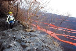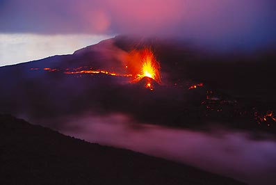 LA NUIT GOMME LES RELIEFSLa deuxième éruption de l'année n'a pas pris par surprise l'observatoire volcanologique du piton de la Fournaise. Depuis plusieurs semaines les signes précurseurs de la deuxième éruption de l'année 2007 s'accumulaient sous les yeux des scientifiques. Vendredi soir, après 2 heures et demie de crise sismique, les enregistreurs de l'observatoire rendent un verdict sans appel vers 23 h. La lave se répand quelque part dans le sud de l'enclos vers 2 000 m d'altitude dans le secteur du cratère Château-Fort. Impossible d'être plus précis à cette heure, ce qui ne fait pas l'affaire de la poignée de passionnés du volcan qui ont pris le chemin du pas de Bellecombe. À chaque fois que le piton de la Fournaise sort de son sommeil, ils sont quelques-uns à se précipiter à son chevet à toute heure du jour ou de la nuit pour immortaliser les premières heures de l'éruption. Ce sont eux souvent qui affinent pour l'observatoire le site précis de l'activité. Comme à chaque fois au pas de Bellecombe sous un ciel piqueté d'étoiles, ce n'est pas toujours le cas, les spéculations vont bon train. En arrière-plan du cratère principal, le ciel est tout juste teinté d'orange. Insuffisant pour situer précisément le site de l'éruption. Faut-t-il monter au sommet ? Ou alors emprunter le balisage de secours par l'est ou par l'ouest ? L'indication donnée par l'observatoire donne une piste. Ce sera le balisage de secours par l'ouest afin de se rapprocher au maximum du cratère Château-Fort. Là on verra bien. Ils ne sont que six à tenter l'aventure. Tous savent par expérience que là où la fissure s'est vraisemblablement ouverte on se trouve aux confins de la partie sud de l'enclos dans un secteur particulièrement difficile d'accès, où les itinéraires ne sont pas légion. Les marches du pas de Bellecombe avalées, la traversée de l'enclos réserve une première surprise. Une lune parfaite flotte au-dessus du rempart de l'enclos. Elle répand une lumière jaune orangée qui rend presque inutiles les frontales. Leur mince pinceau lumineux capture une à une les marques blanches qui tâchent le sol en direction de la chapelle de Rosemont. Jusque-là pas de problèmes. Nous sommes en terrain connu.