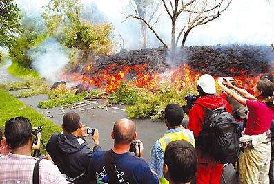 Il est 15 h 35 quand le premier bras de lave arrive sur la route nationale 2. D'abord des volutes de fumée puis un arbre qui s'embrase instantanément sous l'effet de la chaleur et tombe sur la chaussée. Les spectateurs massés contre la barrière de sécurité dressée à 200 mètres de la coulée, retiennent leur souffle. Une grande clameur traverse la foule : "Allez, largue la sauce, fait péter", crie un homme surexcité. Une douce folie s'empare alors de la centaine de badauds qui a bravé les intempéries pour assister à ce spectacle unique. "Bien sûr, j'ai déjà vécu la traversée de la route par la lave. Mais à chaque fois, ce sont des frissons garantis quand la coulée vient manger le bitume", raconte ce Saint-Josephois qui dégaine aussitôt son appareil photo. Chacun dans la foule veut immortaliser l'instant à sa manière : caméscopes et portables sont tendus vers la coulée qui ne cesse de gonfler.