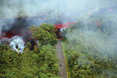 « En fait, je viens tous les jours. J'ai besoin de voir de mes propres yeux ce que fait le volcan. C'est normal, j'ai trois enfants et je veux m'assurer qu'ils ne sont pas en danger », commente Gilles Collete qui lui aussi est venu aux nouvelles. « Parfois les gendarmes ne nous laissent pas passer le barrage. Je ne comprends pas pourquoi. On habite ici, on a le droit de savoir ce qui se passe. Heureusement, dans la plupart des cas on nous laisse passer », dit-il encore. De fait, ils sont tout un groupe d'habitants à franchir le barrage. En quelques dizaines de mètres, l'air devient franchement irrespirable. En contrebas du rempart, le spectacle est sans doute proche de celui qui se jouait au commencement du monde. Une immense mer de lave à peine refroidie en surface mais bouillonnante quelques centimètres en dessous est sillonnée par plusieurs bras de lave. Parfois, des plaques entières de matière encore brûlantes sont soulevées et laissent apparaître des lacs de lave. Deux coulées se jettent dans la mer provoquant d'immenses panaches de fumée. Le spectacle est magnifique. « Oui, pas pour les gens qui habitent ici. Pour nous c'est un danger et franchement nous souhaitons qu'il se termine le plus rapidement possible », lance Rico, président d'une association de quartier.