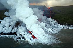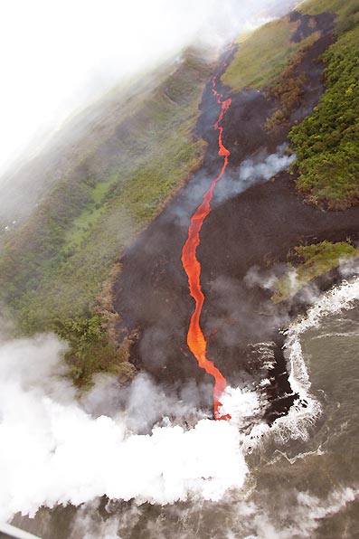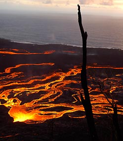 Depuis lundi 21 h 25, heure à laquelle la première coulée a atteint l'océan, le spectacle se partage désormais dans le Grand-Brûlé entre les fontaines de lave qui jaillissent à 600 m d'altitude et le bord de mer où le mariage du feu et de l'eau compose une symphonie sur un mode majeur.