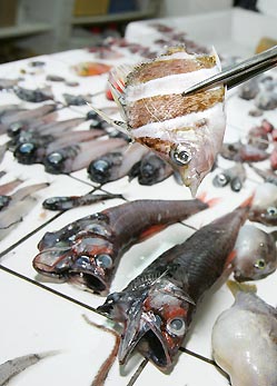 CADEAU DU VOLCAN« Après les avoir photographiés, on va les conditionner, les mettre dans des petits sachets et les congeler », poursuit Alain Barrère. Si les conditions de cette mort n'apparaissent pas très évidentes aujourd'hui, la satisfaction est au rendez-vous. « On va faire un pas en avant sur la population abyssale de La Réunion. Normalement on répertorie une espèce tous les six mois. Là, on va en rajouter plusieurs dizaines d'un coup, c'est assez sympa ! », se réjouit Patrick Durville. De par leur lieu de vie très difficilement accessible, la recherche avance lentement, et le mystère des abysses ne s'éclaircit pas facilement. « Normalement, il faut développer des stratégies, des pièges, pour les approcher ». Le volcan a fait un véritable cadeau à la communauté scientifique. Dans un premier temps, il va falloir se lancer dans les nombreuses bibliographies sur le sujet, pour retrouver qui est qui. Et ainsi répertorier les nouveaux venus pour les ajouter à une liste qui compte environ 1 000 poissons, tous issus des eaux réunionnaises. Ensuite, pour ceux qui restent étrangers, une autre méthode s'impose. « Ce sont des espèces très pointues qui exigent qu'on se penche longuement dessus », l'objectif visant à rassembler le maximum de critères. D'où la nécessité d'avoir recours aux compétences d'un taxinomiste, un véritable spécialiste de la classification des organismes vivants. Un spécialiste du Muséum d'histoire naturelle de Paris pourrait se rendre à La Réunion pour plancher sur le sujet, accompagné par l'Aquarium de La Réunion, l'ARVAM et la Maison du Volcan.