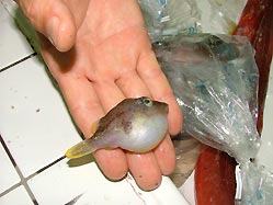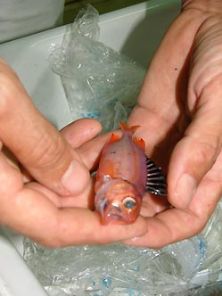 « C'est exceptionnel, on ne les voit jamais, ils vivent à plus de 500 mètres de profondeur pour certains. D'habitude, ce sont des poissons coralliens, de faible profondeur », témoigne Alain Barrère, conseiller scientifique de la maison du Volcan et membre du Centre de documentation et de diffusion sur le volcanisme. Habituellement, les experts observent ces bêtes étranges... dans du formol. « C'est une chance extraordinaire, d'habitude il faut un sous-marin pour les observer. Et là un canot pneumatique et une épuisette ont suffi ! », exulte Patrick Durville, biologiste à l'Aquarium. Face à la petite équipe passionnée, en pleine réflexion hier après-midi à l'Aquarium de Saint-Gilles, des dizaines de poissons ne font pas les fiers. L'échantillonnage vient de se terminer. Ils montrent leur bouche béante dans laquelle une poche blanche se laisse apercevoir. Il s'agit de la vessie natatoire, remontée par la variation de profondeur et la diminution de la pression lors de la remontée vers la surface. Certains commencent à perdre leur couleur. « Il faut rapidement qu'on les photographie et qu'on les congèle », glisse Alain Barrère. De par son allure étrange, une espèce attire particulièrement l'attention. Mais qu'on se rassure, la nature n'y est pour rien dans cette morphologie. Il a tout simplement cuit dans l'eau bouillante, prêt à être avalé ! Chez d'autres bestioles, les yeux sont exorbités. Dans cette pêche quelque peu inhabituelle, les passionnés parviennent à identifier environ la moitié du lot. Patrick Durville, livre en main, vient de faire avancer le schmilblick, en quelques minutes. Dans cette encyclopédie, il vient de repérer le dessin d'un des animaux. « Ce poisson papillon est connu mais n'a jamais été décrit à La Réunion. Grâce à l'événement, un de plus ! », se félicite-t-il.