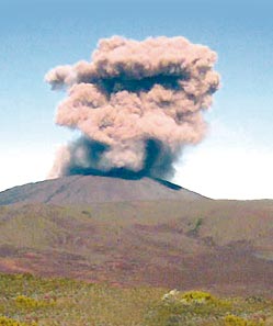15 h 05 hier après-midi, des volutes grises, très chargées en particules, s'élèvent vers le ciel. Le cratère Dolomieu s'est effondré une seconde fois hier après-midi et menace désormais d'emporter son voisin dans sa chute.