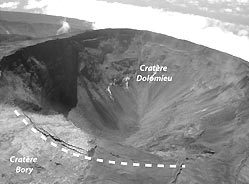 Le cratère Dolomieu, jusqu'à la semaine dernière, offrait l'aspect d'un vaste plateau (1ère photo). Vendredi, il s'est effondré une première fois, révélant un gouffre de 300 mètres de profondeur. La cloison qui le séparait du cratère Bory a en partie disparu. Jeudi (2ème photo), il s'est effondré une seconde fois, entraînant dans le chaos un vaste pan de son voisin, le cratère Bory. Les fissures déjà présentes s'y sont encore élargies et tout indique que la zone qu'elles délimitent va prochainement elle aussi disparaître... (photos OVPF).
