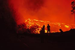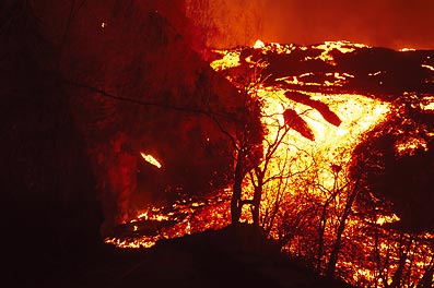 À peine entamée la descente des rampes de Bois-Blanc, on ne peut ignorer ce qui se passe dans le Grand-Brûlé. Dans la direction du rempart du Tremblet, le ciel a des couleurs d'incendie. Des fontaines de lave dressent un rideau de feu et des rivières de roches en fusion dévalent les pentes. En dépit de l'heure matinale, ils sont nombreux à vouloir profiter du spectacle. Le parcours d'obstacle ne refroidit pas les enthousiasmes. Il faut abandonner sa voiture à plusieurs kilomètres, avaler du bitume avant de rejoindre la coulée de 1976. Impossible pour l'instant d'aller plus loin. Mais, de ce poste d'observation on en prend déjà plein la vue. A 600 m d'altitude au-dessus de la route la fissure envoie vers le ciel à jet continu la lave en fusion.