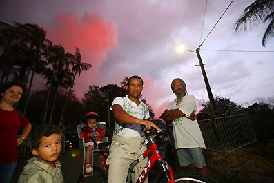 Une fillette sursaute dans les bras de sa mère quand l'écorce d'un arbre éclate à proximité. Des "Oh" admiratifs ponctuent l'embrasement des filaos réduits à l'état de fétus de paille. "Eh ! Poussez-vous devant, on ne voit rien", lancent des spectateurs exaspérés, aux forces de l'ordre et aux journalistes qui leur cachent le spectacle. La bronca enfle et un gendarme est obligé de hausser le ton pour faire cesser la fronde et chasse les inévitables resquilleurs qui ont franchi les barrières de sécurité. À 16 heures, ils ne sont plus qu'une petite soixantaine d'irréductibles à supporter les nuages de soufre que le vent rabat désormais. La plupart des badauds a préféré rebrousser chemin pour admirer le point de vue d'ensemble offert à quelques centaines de mètres de là. L'un d'entre-deux lâche : "Je ne rentrerai pas chez moi avant que la lave n'atteigne la mer". Brice Magné